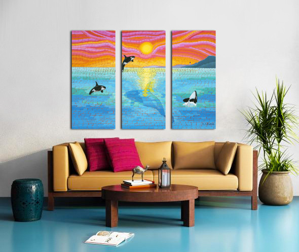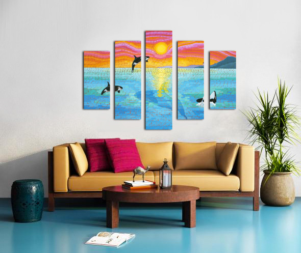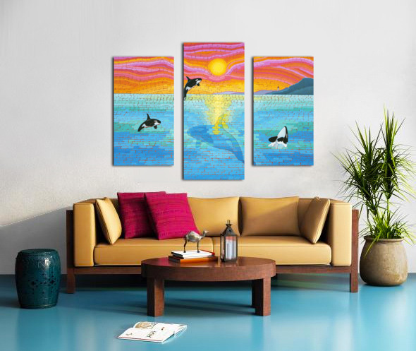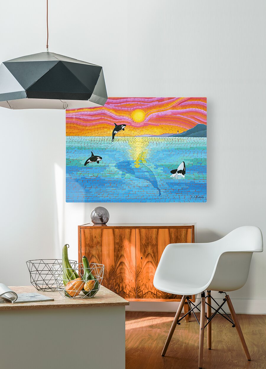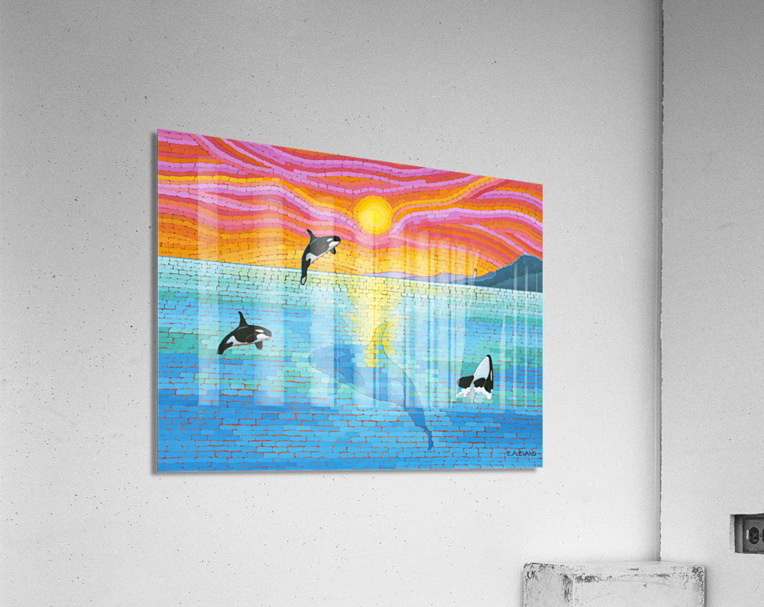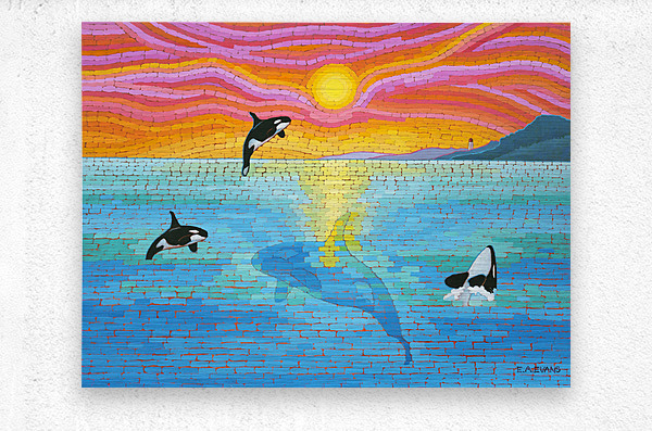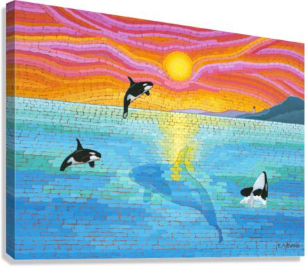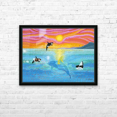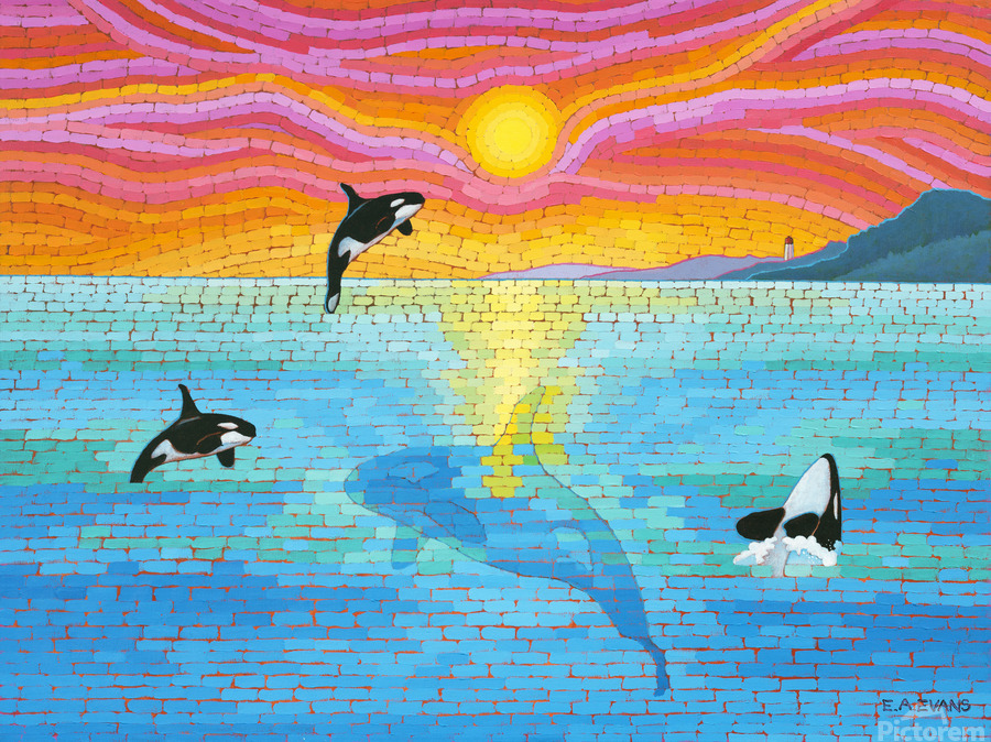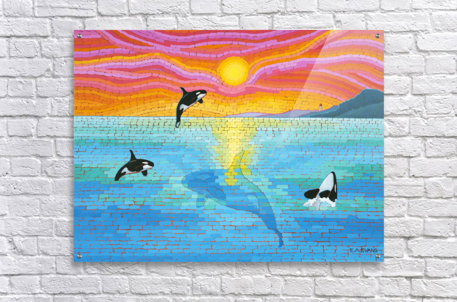 Artist Comments:...The Orcas are busy being marine mammals. Leaping, breaching and spyhopping. It’s an amazing site. The lighthouse in the background reminds one there is danger and the shadow of the orca indicates the potential for the loss of these and many other amazing sea creatures.