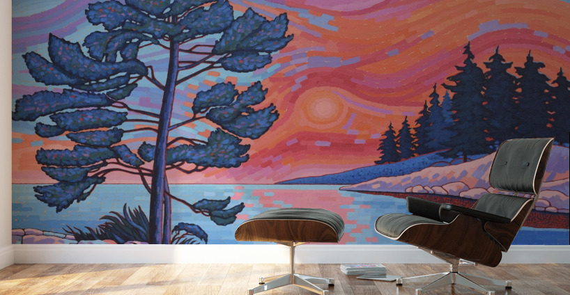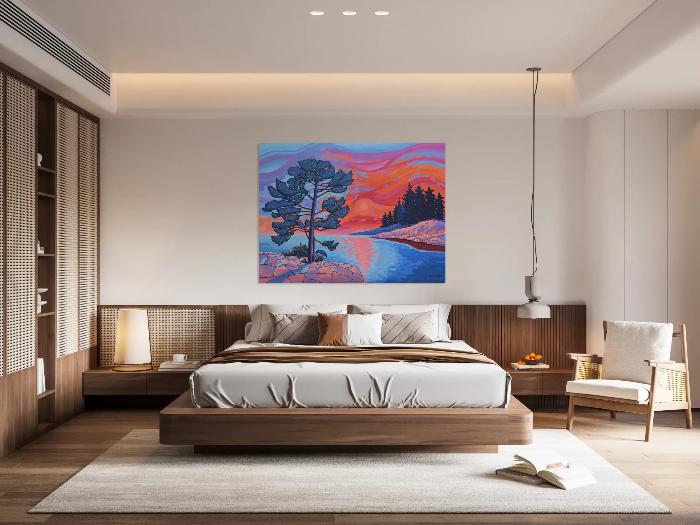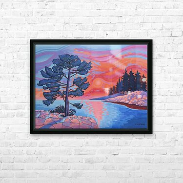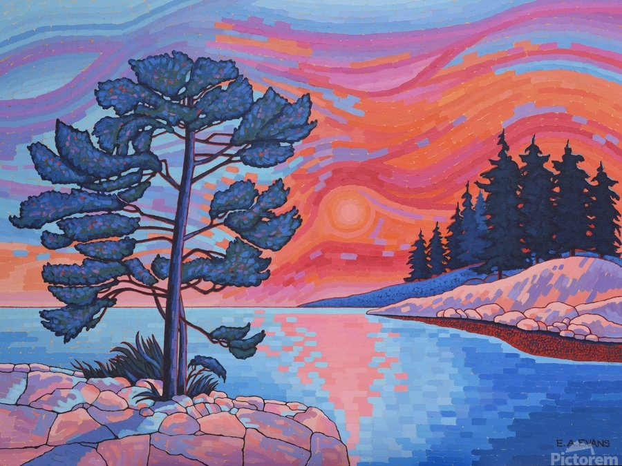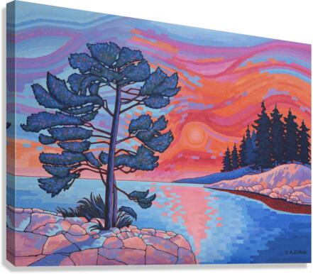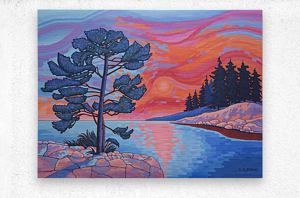 Artist Comments:... A spectacular sunset on a quiet inlet in Ontario shows the bright reflection of sun on water. The craggy, rocky shore supports a lone pine tree that has managed to hold onto a small piece of rocky ground and push its way up towards the sky. It looks healthy and not wind-bent since the inlet provides shelter from the harshest winds. The arms of the tree are open and embrace the last of the day’s sunshine. The sky is on fire with the different hues that comes from a clouded sky at sunset. This magnificent pine tree spoke to me. I was compelled to pay homage to its tenacity and ability to flourish on the rocks as it stood as a tall sentinel overlooking the water.