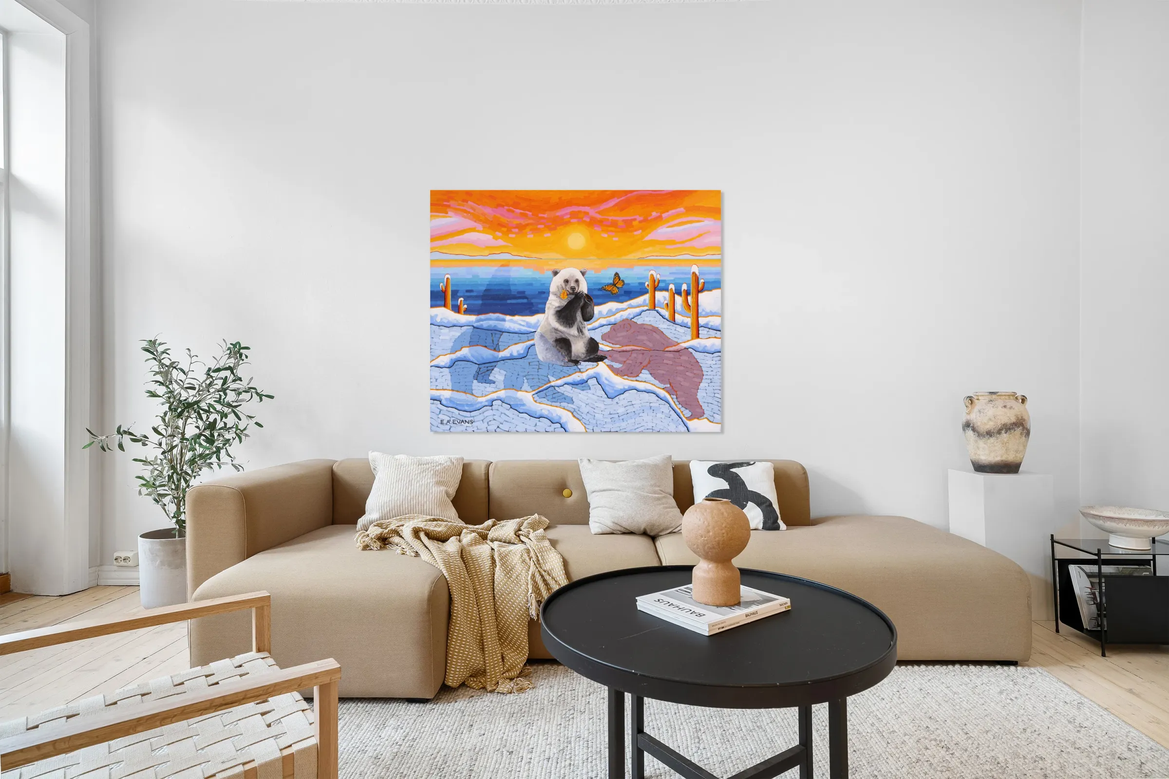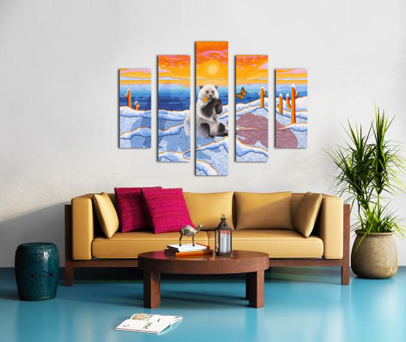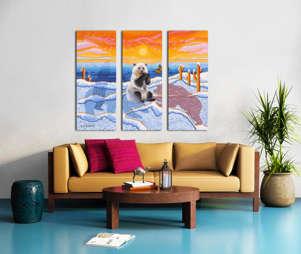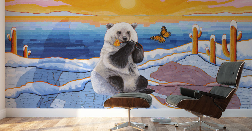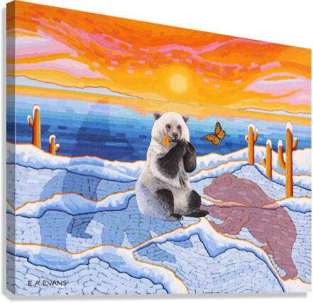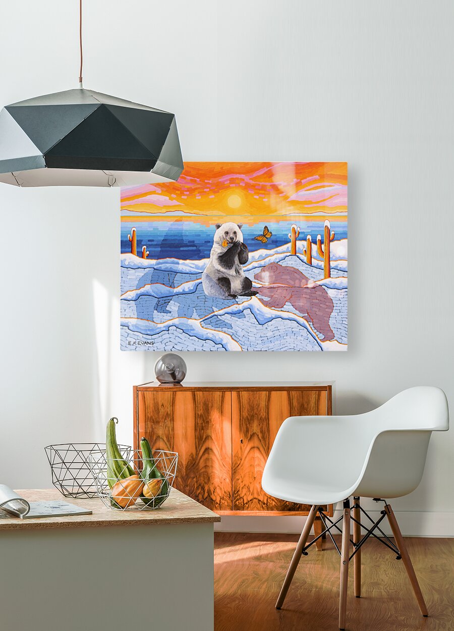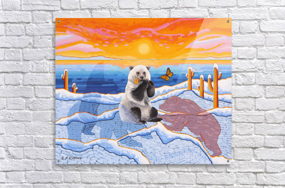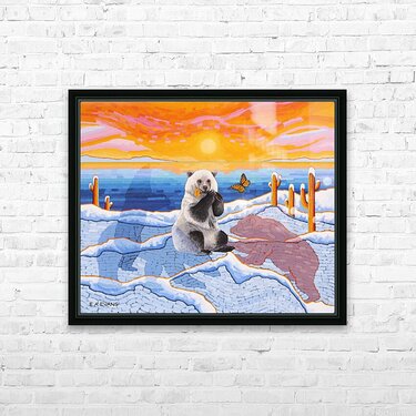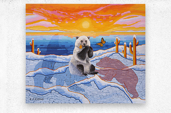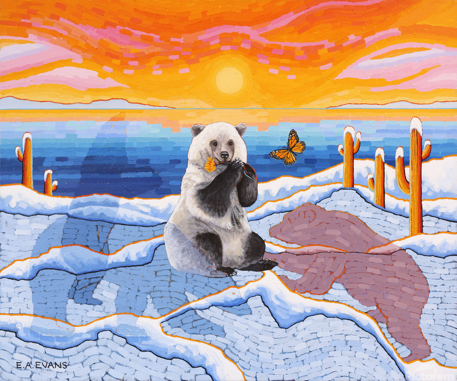 Artists Comments...A Pizzly is a hybrid cross between a Polar Bear and a Grizzly Bear. Pizzlies are the result of Polar Bears venturing South due to climate change. This painting is meant to depict a topsy-turvy world of plants and animals seemingly out of place. Cactus in the Arctic? What’s a butterfly doing there? The painting is posing questions and asking the viewer to consider what is happening in the natural world. The Monarch butterfly is fighting its own battle for survival due to the loss of habitat in Mexico and the loss of milkweed from agricultural herbicides.